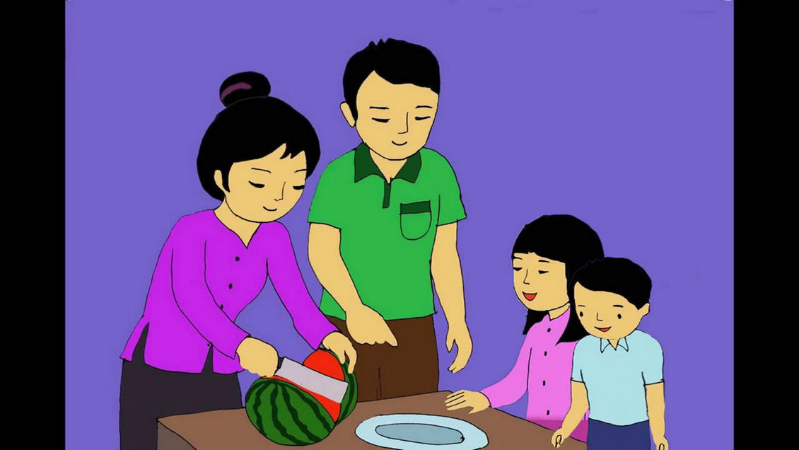 Mẹ dùng dao cắt dưa, chị Hoa dưa một miếng dưa mời bố và nói: “Con mời bố ạ!” Bố khen chị Hoa: “Con gái của bố ngoan lắm, bố cảm ơn con!”.