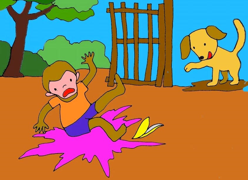 Vừa nói dứt lời thì khỉ bị trượt chân, ngã xuống đất một cái thật đau. A ! hóa ra là những vỏ chuối mà Khỉ con vứt bừa bãi hồi trưa đã làm Khỉ con ngã đấy! Thấy Khỉ con ngã, chó vàng chạy đến đỡ Khỉ con dậy. Sau đó chó vàng nhặt tất cả những vỏ chuối đang nằm rải rác trên sân bỏ vào thùng rác. Khỉ con cảm ơn chó Vàng rồi ngượng ngùng nói với bạn: