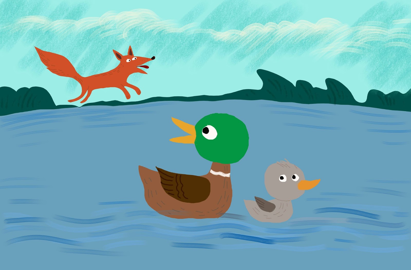 Thích quá, chú nhảy xuống mò lấy, mò để. Lúc ăn đã gần no, chú mới nhìn lên chẳng thấy Vịt mẹ đâu cả. Hoảng sơ, chú nhảy lên bờ gọi mẹ ầm ĩ : “Vít… vít… vít”. Gần đấy có một con cáo đang ngủ, nghe tiếng Vịt kêu, Cáo liền nhỏm dậy.
