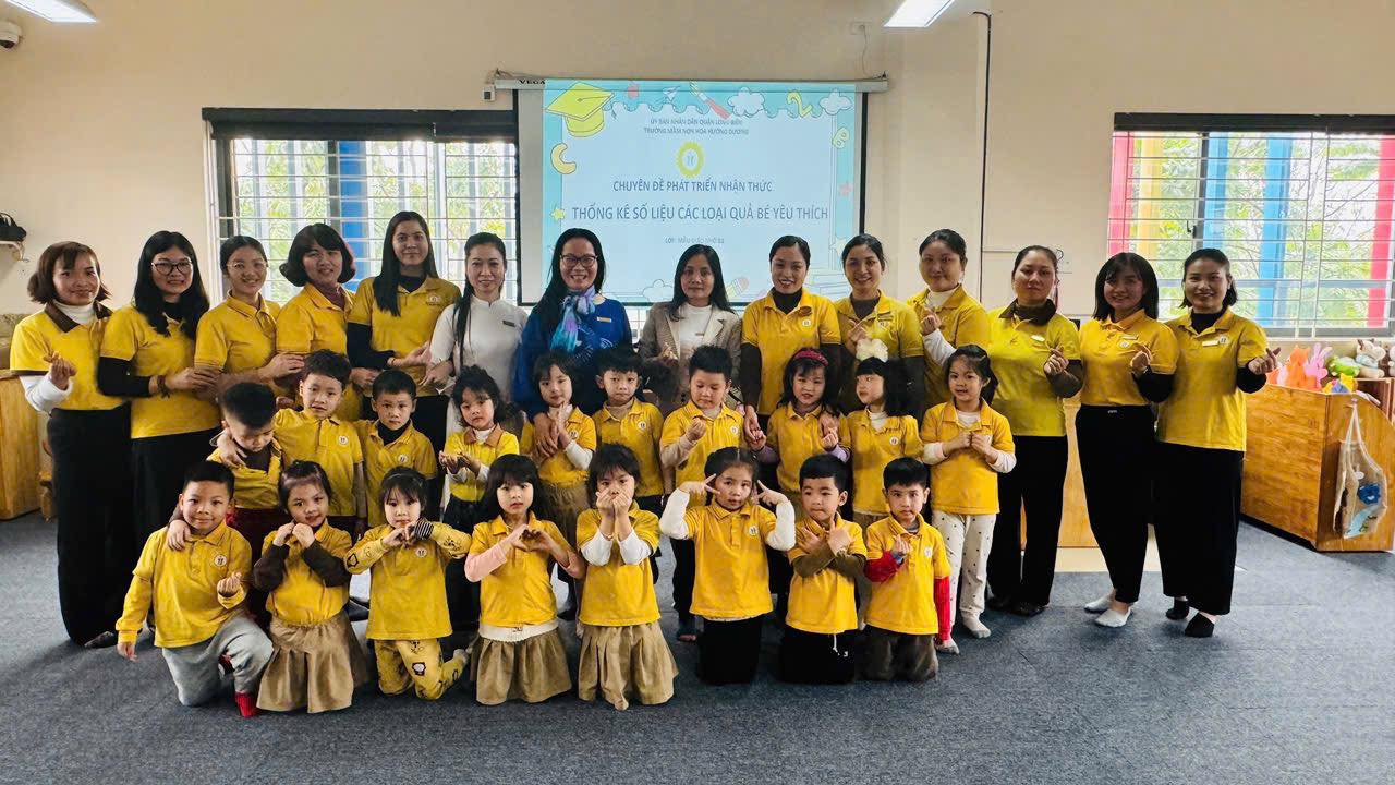 chính quy từ 5 tuổi, Trường MN Hoa Hướng Dương hiểu tầm quan trọng của việc áp dụng các tiêu chuẩn và thông lệ quốc tế để tạo nền móng cho thành công trong tương lai của các con, thiết kế chương trình thống kê trở nên dễ tiếp cận và lôi cuốn đối với các con. Hôm nay các cô lớp MGN B1 đã tổ chức các hoạt động tương tác như khảo sát đơn giản (như hỏi các bạn trong lớp thích loại trái cây nào) và hình thức biểu diễn dữ liệu sáng tạo (như xếp hình trái cây theo nhóm, tích lên bảng…), các bạn nhỏ không chỉ học các kĩ năng cơ bản của việc thu thập và giải thích dữ liệu mà còn phát triển các kỹ năng như đặt câu hỏi, tương tác với bạn bè, đếm số, so sánh, tổng hợp… Đây là những kỹ năng tư duy bậc cao trong thang nhận thức Bloom. Những hoạt động này được thiết kế để kích thích sự tò mò, khuyến khích việc đặt câu hỏi và nuôi dưỡng tình yêu học hỏi vượt ra ngoài phạm vi lớp học.