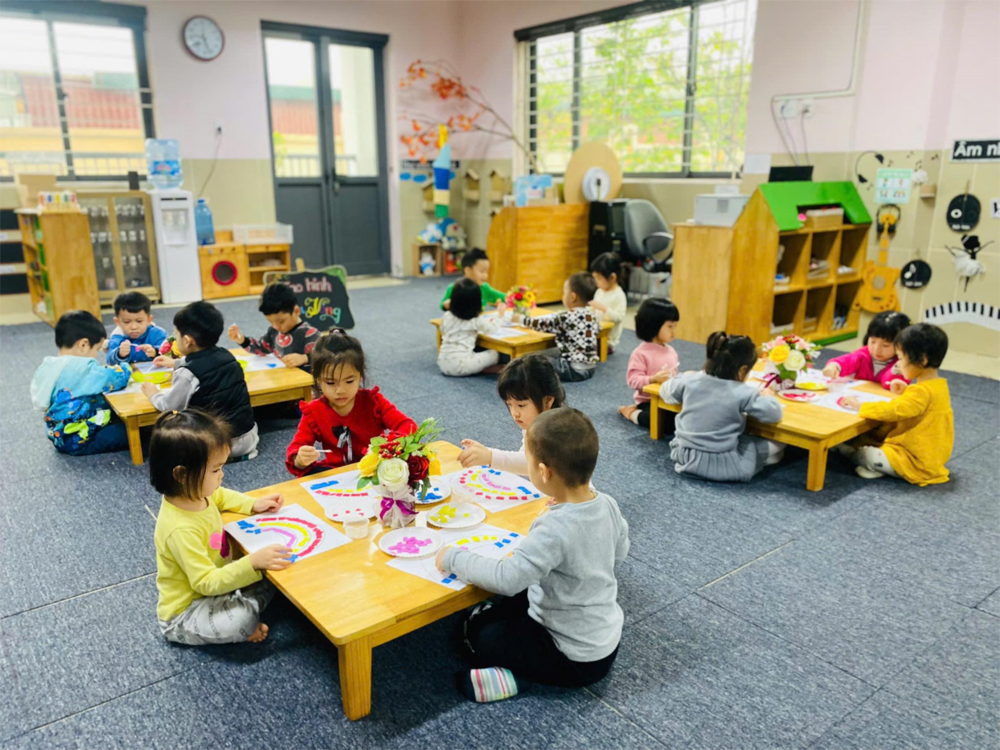 Qua hoạt động, các con được rèn thêm sự kiên trì và tập trung hơn, con biết làm việc nhóm tự tin vì mình đã tự hoàn thành được bức tranh bảy sắc cầu vồng.