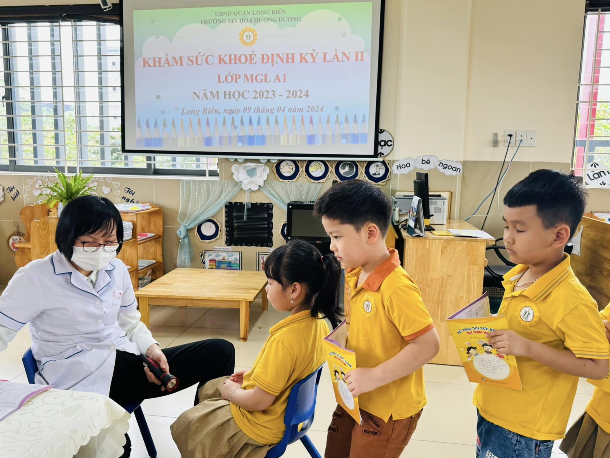 2023- 2024, hôm nay, ngày 09/04/2024 trường MN Hoa Hướng Dương phối hợp với Trạm Y tế Phường Việt Hưng tổ chức khám sức khỏe định kỳ lần 2 cho 100% các con học sinh trong nhà trường với các nội dung: Cân nặng, chiều cao, khám tai, mắt, mũi, họng, kiểm tra tim phổi và một số bệnh liên quan đến đường hô hấp, da liễu ...