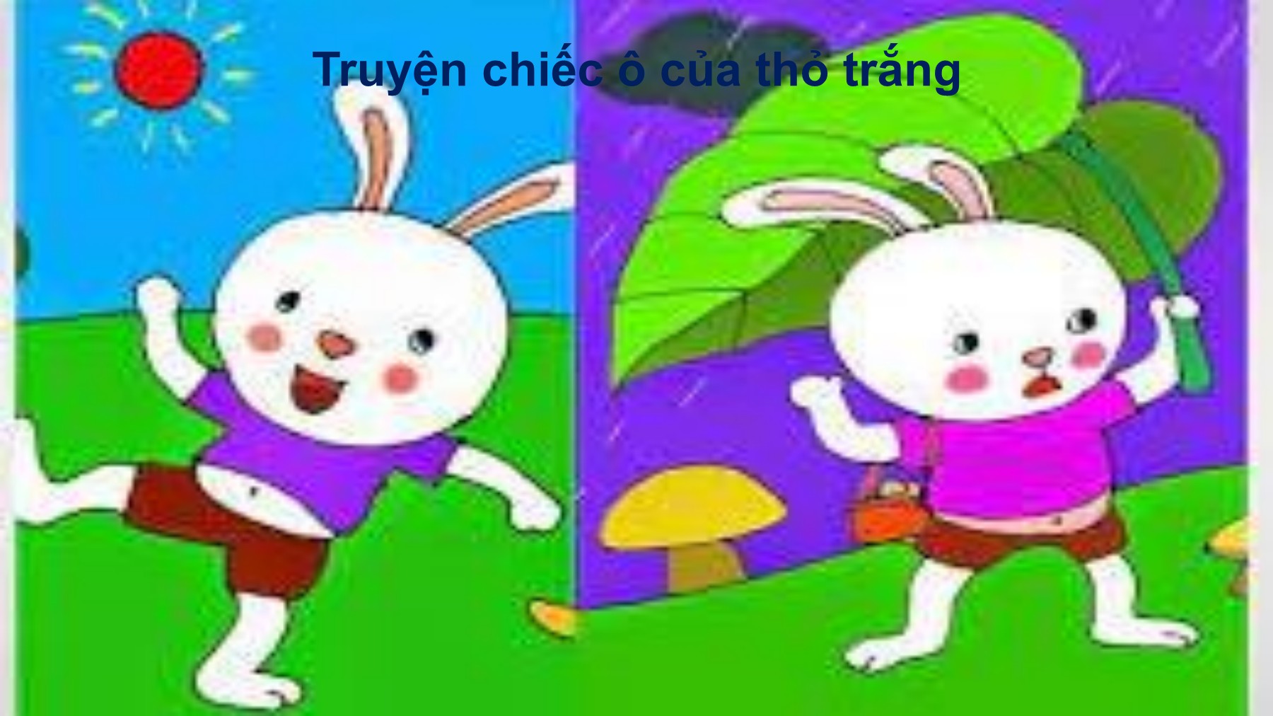 Một buổi sáng đẹp trời, Thỏ trắng thích thú chạy nhảy, ngắm hoa, hái nấm trên bãi cỏ xanh mướt. Bỗng nhiên, trời nổi gió và mưa như trút. Thỏ Trắng vội bẻ ngay lá to làm ô che đầu để khỏi bị ướt.; Đi được một quãng, Thỏ Trắng nhìn thấy một chú Gà Con miệng kêu “ chiếp chiếp “, chẳng có gì để che đầu. Thỏ Trắng vội gọi: