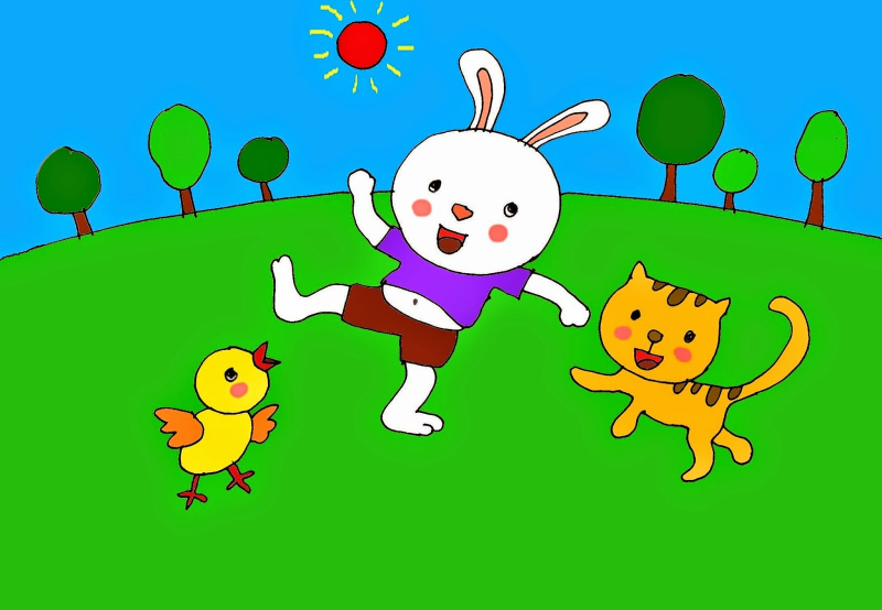Khi mưa tan, mặt trời mỉm cười, Thỏ Trắng, Gà con và Mèo con hạnh phúc đùa giữa ánh nắng.