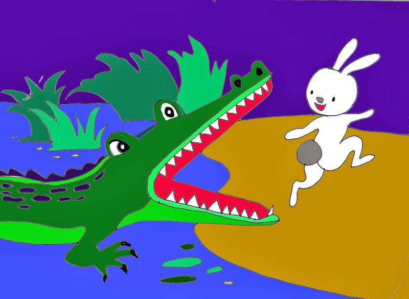 Vào một lần chú Thỏ đến bên bờ sông và bứt ngọn cỏ non nhai ngấu nghén. Có một con cá sấu ở gần đó và nó nằm im giả vờ như không nhìn thấy. Thỏ con yên trí ăn cỏ và cá sấu giả bộ hiền lành từ từ và bò đến bên Thỏ rồi đột nhiên đớp gọn Thỏ con vào mồm.