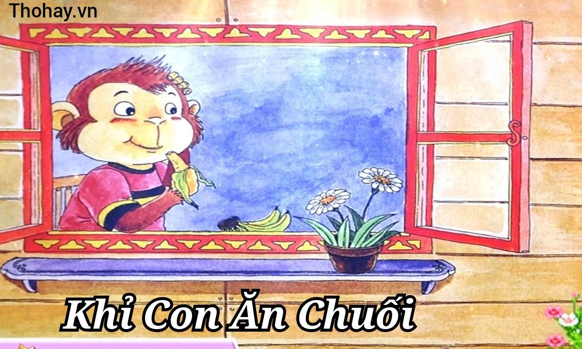 Khỉ con vừa ăn vừa ném vỏ chuối ra ngoài cửa sổ. Ăn xong cả nải chuối, khỉ con lăn ra ngủ khò khò. Chiều đến, khỉ con nghe tiếng chó vàng reo réo ngoài cổng: